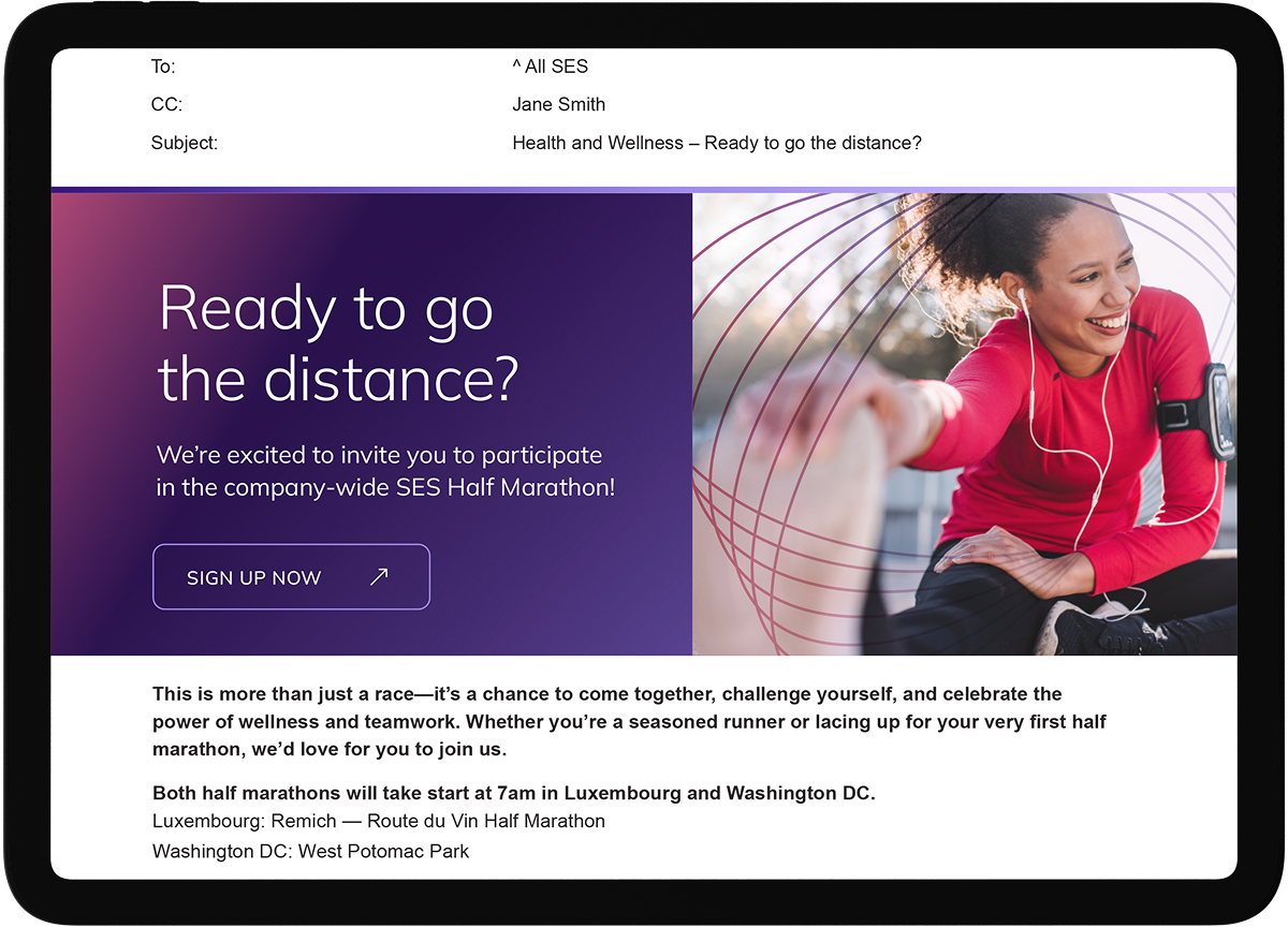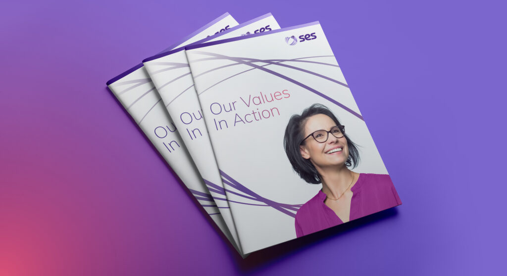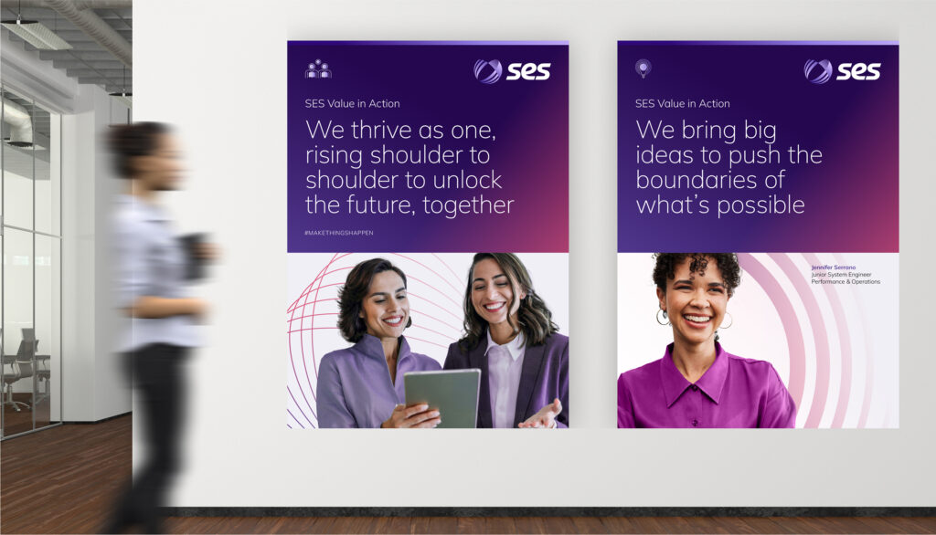 To inform and inspire employees about the brand, we built a messaging platform centered around the new purpose, “Space to make a difference.” From refreshed core values and an employee value proposition (EVP), to a new internal VIBE (Visual Identity Brand Expression) and activation campaign, we delivered a comprehensive internal brand experience that elevates employees to the center of SES’s future-focused story.